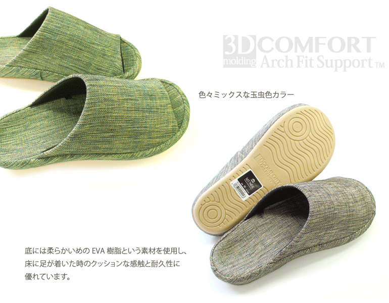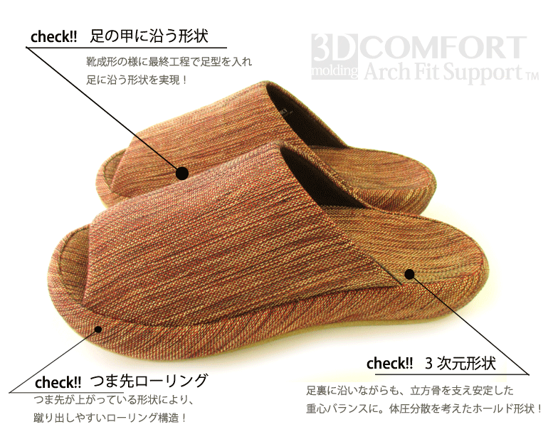 歩行スタイルと姿勢バランスにこだわったこだわりのスリッパの登場!その名も『3D COMFORT』中敷部分には足裏のアーチに沿った3次元形状の設計により、足に優しく快適な室内履きとして開発しました。